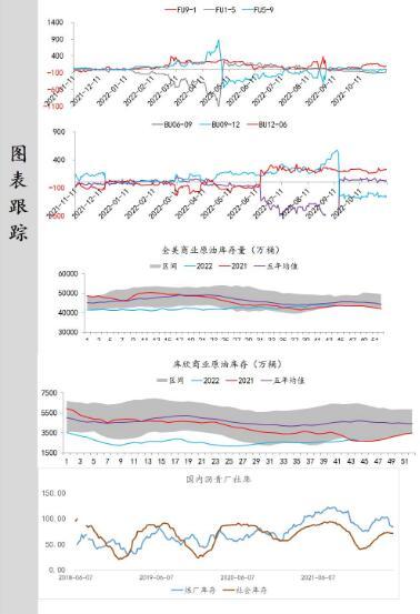 供应端:据美国能源信息署最新数据显示,截止2022年11月4日当周,包括战略储备在内的美国原油库存总量8.36974亿桶,比前一周上升35.2万桶;美国商业原油库存量4.40755亿桶,比前一周上升392.5万桶;战略原油库存量3.96219亿桶,比上一周下降357.3万桶;美国汽油库存总量2.05733亿桶,比前一周下降90万桶。商业原油库存比去年同期高1.30%,比过去五年同期低2.24%;汽油库存比去年同期低3.28%,比过去五年同期低约6.20%;馏分油库存比去年同期低14.65%,比过去五年同期低18.17%。