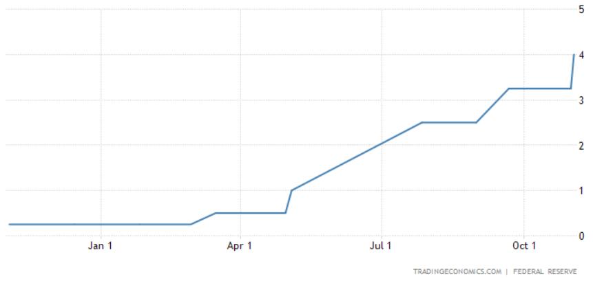 由于美联储此前误判通胀形势,所以从今年3月以来,鲍威尔追赶通胀的步伐越来越急迫。随着上周连续第4次祭出75基点加息后,年内美国的政策利率已经从接近零利率升至3.75%-4%。