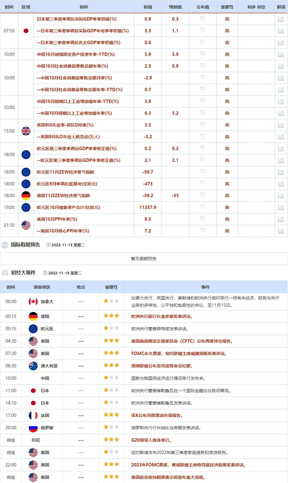 11月15日当天,欧洲央行副行长金多斯、纽约联储主席威廉姆斯和费城联储主席哈克都将发表讲话,投资者需关注他们对于经济和货币政策前景的最新观点。
