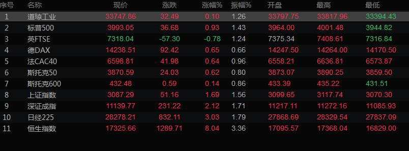 美股收盘情况:标普500指数上涨0.93%,收于3993.05点。纳斯达克指数大涨1.88%至11323.33点,而道琼斯工业指数上涨0.10%至33749.18点。
