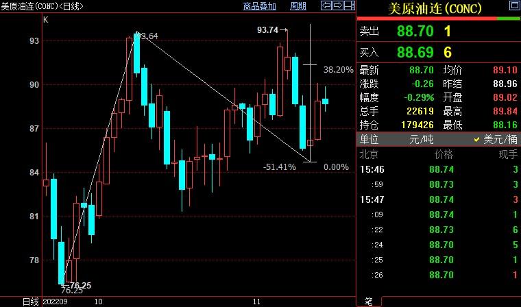 北京时间15:53,NYMEX原油期货下跌0.33%至88.67美元/桶;ICE布伦特原油期货下跌0.22%至95.78美元/桶。