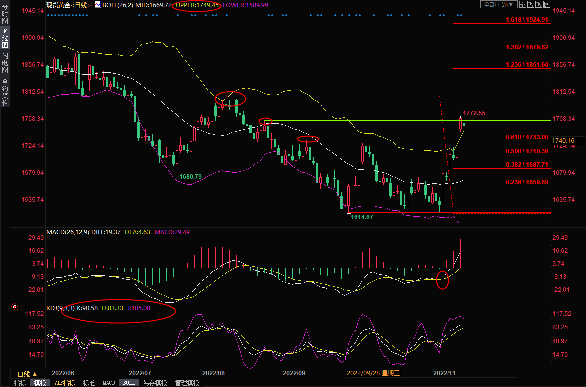 鉴于短线金价涨幅较大,KDJ发出短线超买信号,金价短线存在一些回调风险,可能会对9月12日高点1735.02位置进行回踩确认,失守该位置附近支撑前,后市偏向多头;布林线上轨1749.38附近也存在一定的支撑;11月9日高点支撑在1722.24附近,100日均线支撑在1714.13附近,或意外回落至该位置下方,则增加短线看空信号。