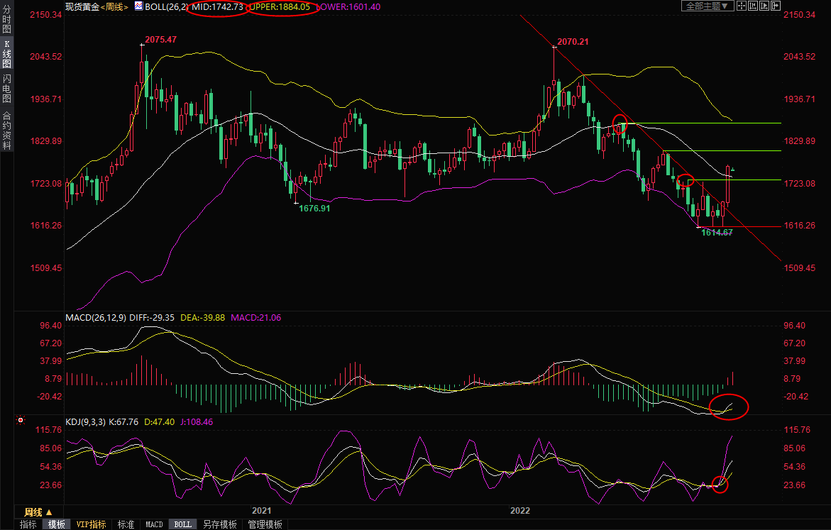 周线级别:单边下跌后反弹;金价在1615附近筑底成功,不仅顶破了下行趋势线阻力,而且顶破了布林线中轨1742.87附近阻力,MACD和KDJ金叉良好运行,后市走势初步转为多头,有望进一步涨向布林线上轨1884.26附近,6月份高点1878.65附近强阻力也相去不远。短线的话,8月12日当周高点1807.72附近也还存在一定的阻力。
