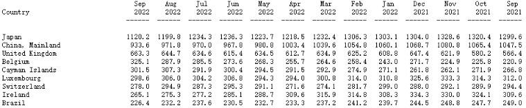 在美债持仓规模前十的国家和地区中,只有排在第三和第四的英国与比利时,在9月出现了增持,但这两国的增持幅度加起来还没日本的减持幅度大。
