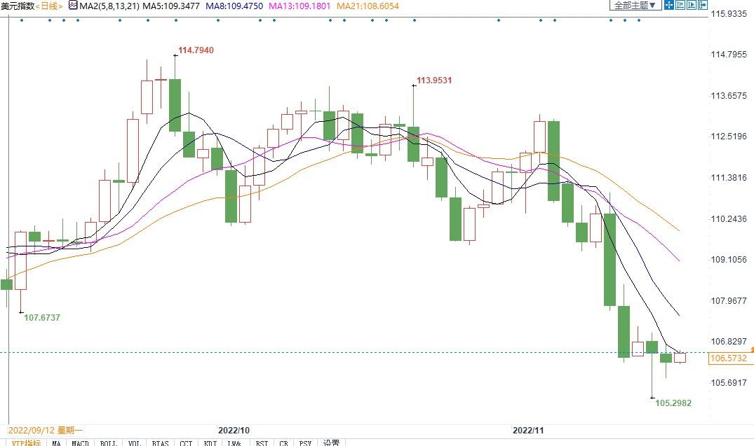 美元指数在9月底创下了114.1的多年高点,The Technical Trader的分析师Bill McNamara表示:“尽管此后价格走势有些波动,但从图表展望来看,仍然没有什么迹象表明美元指数即将出现重大逆转。然而,这就是上周美元在通胀数据的影响下暴跌的结果:美元收盘下跌3.8%,这是自2020年3月以来最大的单周跌幅……很难想象这没有标志着反弹的结束。”