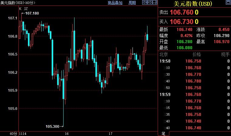 北京时间19:59,现货黄金下跌0.46%至1765.41美元/盎司;COMEX期金主力合约下跌0.42%至1768.3美元/盎司;美元指数上涨0.45%至106.750。