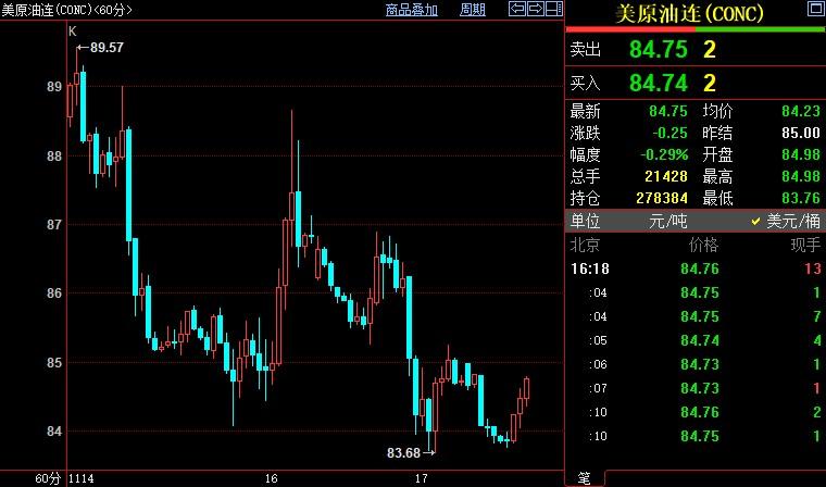 北京时间16:18,NYMEX原油期货下跌0.33%至85.31美元/桶;ICE布伦特原油期货下跌0.12%至91.53美元/桶。
