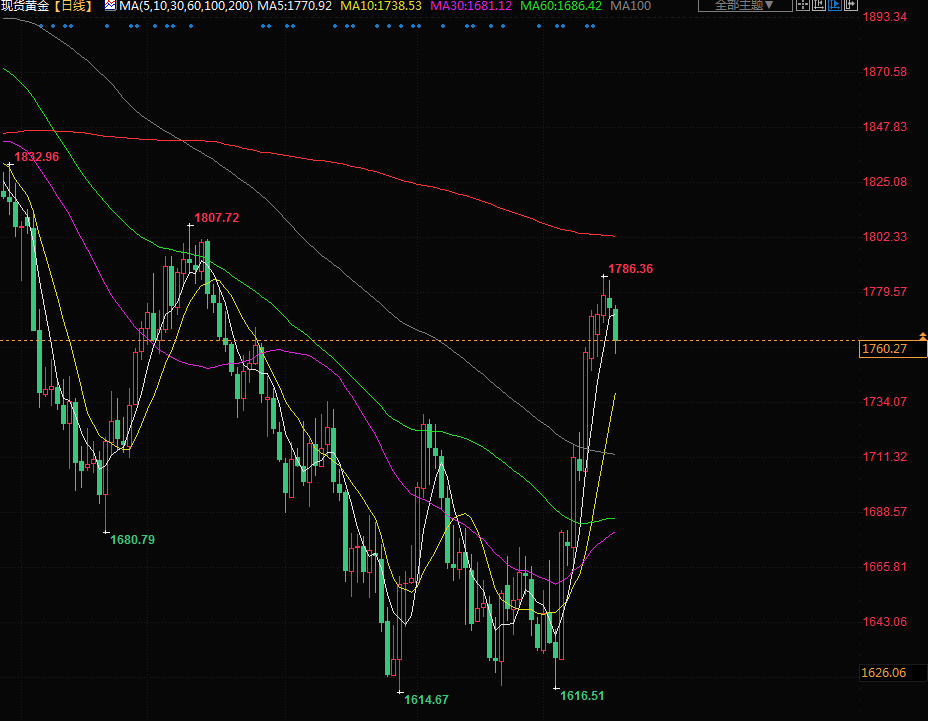 金价周四下跌近1%,美元反弹,美联储官员最近的发言暗示将继续收紧政策以抑制通胀。 现货金下跌0.8%,至每盎司1760.43美元,盘中稍早曾跌至1753.6美元。RJO Futures高级市场策略师Bob Haberkorn表示,美联储官员表示美国通胀需要进一步放缓,“市场将这解读为利率将更高,导致黄金隔夜遭遇抛售。美元因美联储仍将继续加息的这些言论而走强,黄金在利率上升中首当其冲受到打击。”