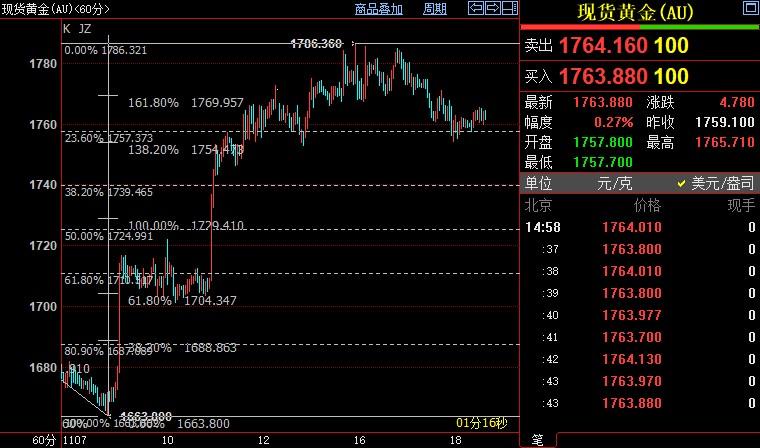北京时间15:03,现货黄金上浮0.24%至1764.40美元/盎司;COMEX期金主力合约上浮0.20%至1766.6美元/盎司;美元指数下跌0.17%至106.484。