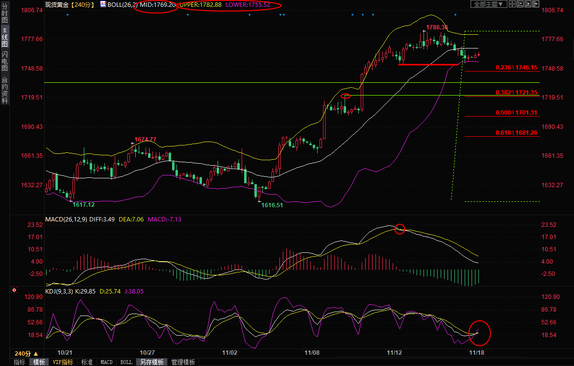 此外,布林线中轨1769.21附近也存在一些阻力,由于MACD死叉运行,如果不能顶破该阻力,则需要提防金价的进一步回调风险,如果跌破本周低点1753.18附近支撑,则增加短线看空信号;1616-1786涨势的23.6%回撤位支撑在1746.15附近,9月12日高点支撑在1735.02附近,该位置支撑相对较强,38.2%回撤位支撑在1721.35附近。
