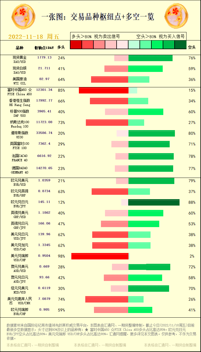 一张图:交易品种枢纽点+多空占比一览。截止今日(2022/11/18周五)目前最新多空数据显示,头寸达到80%及以上的品种有:★ 富时中国A50 ☆FTSE China A50多头占比高达85%。欧元兑日元 EUR/JPY空头占比高达88%。