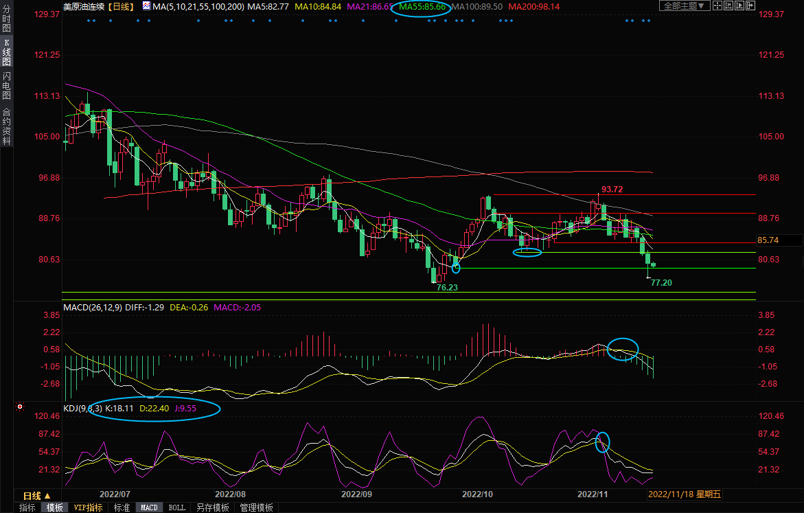 上方初步阻力在布林线下轨80.28附近,10月18日低点82.06已经转化为较强的阻力所在,若能收复该位置,则削弱短线看空信号;11月15日低点支撑在84.04附近。