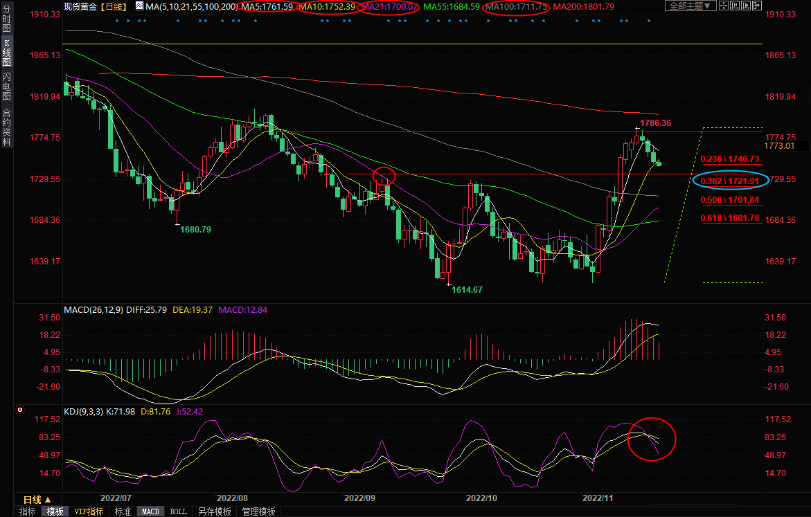由于MACD金叉信号仍在,若能守住1721.91附近支撑,则多头中线仍有机会,上方初步阻力在10日均线1752.40附近,5日均线阻力在1761.61附近,若能收复该位置,则削弱短线看空信号。