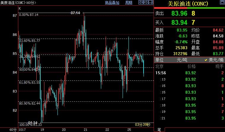 北京时间15:57,NYMEX原油期货下跌0.78%至83.92美元/桶;ICE布伦特原油期货下跌0.67%至90.60美元/桶。
