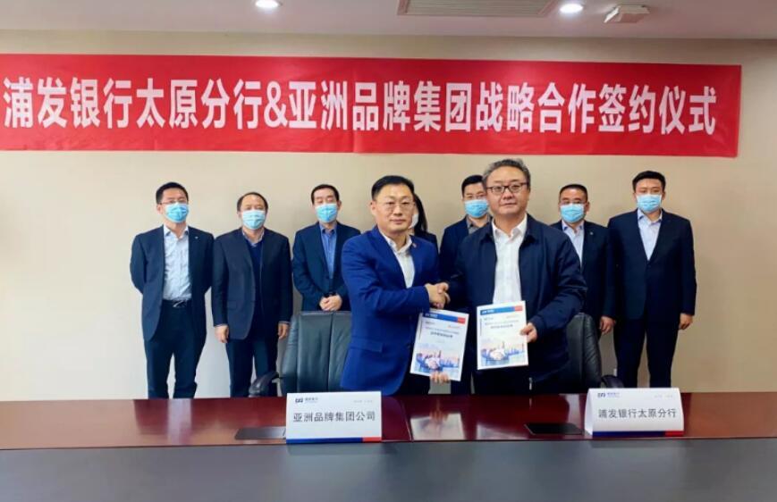 中国亚洲经济发展协会常务副会长、Asiabrand集团创始人兼CEO王建功(左)与浦发银行太原分行党委书记、行长白海忠(右)签署战略合作协议。