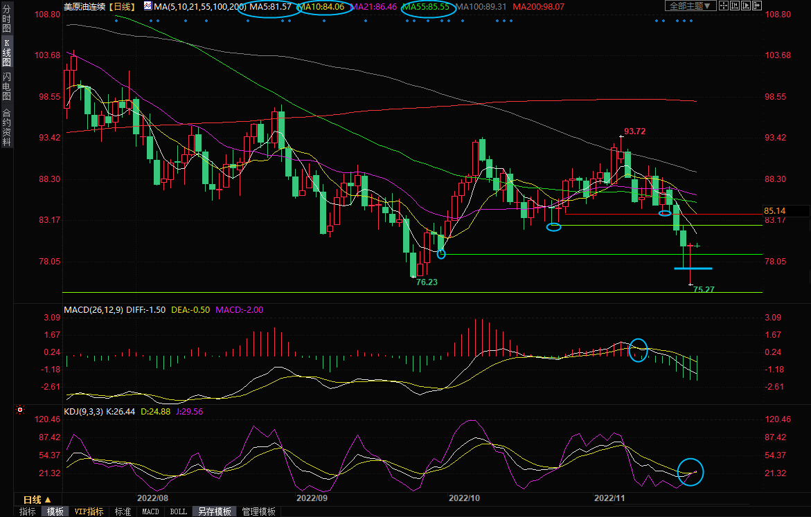 不过,KDJ已经在低位初步死叉,上一交易日录得长下影线十字星,如果本交易日录得阳线,则需要提防见底的可能性,初步阻力在5日均线81.54附近,10月21日低点和上周五高点阻力在82.62附近,若能收复该位置,则增加短线看涨信号。