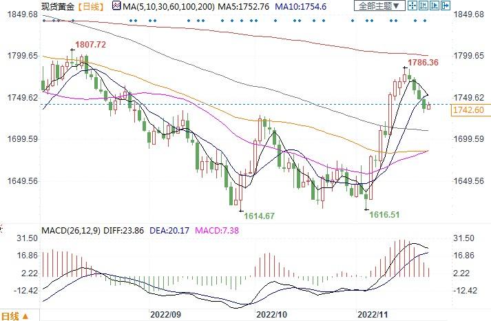 北京时间11月22日14:22,现货黄金报1741.63美元/盎司
