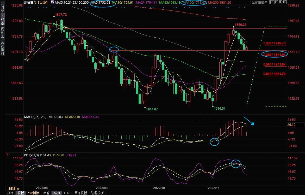 日线级别:震荡上涨后回调;金价在1786附近受阻后快速回落,连续四个交易日收跌,KDJ死叉,5日均线初步下穿10日均线,需要提防“倒V”反转的可能性,短线继续关注9月12日低点1735.02附近支撑,重点关注1616-1786涨势的38.2%回撤位1721.91附近支撑,如果下破该支撑,则增加后市看空信号。