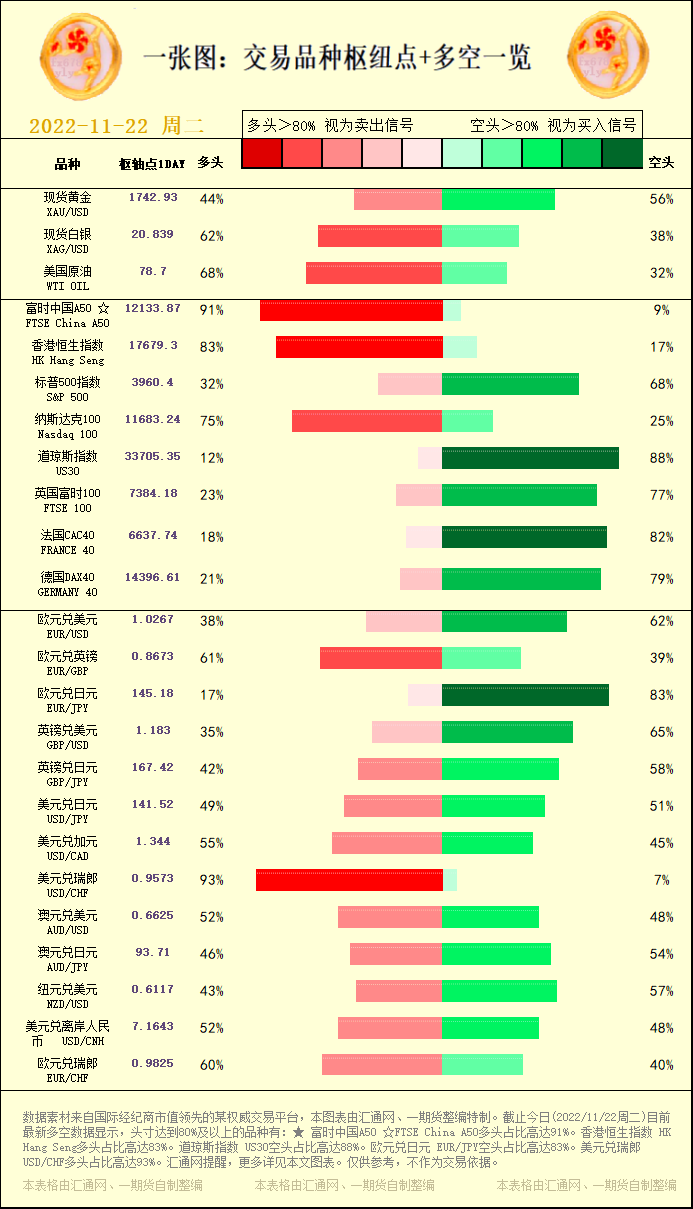 一张图:交易品种枢纽点+多空占比一览。截止今日(2022/11/22周二)目前最新多空数据显示,头寸达到80%及以上的品种有:★ 富时中国A50 ☆FTSE China A50多头占比高达91%。香港