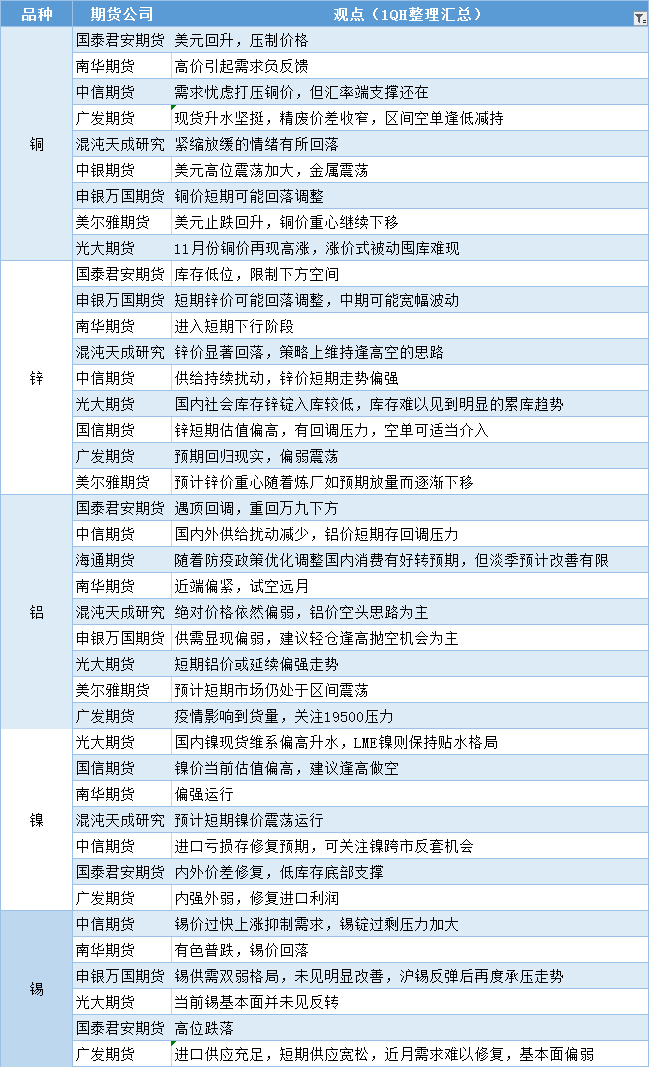标题:期货公司观点汇总一张图:11月22日有色系(铜、锌、铝、镍、锡等)