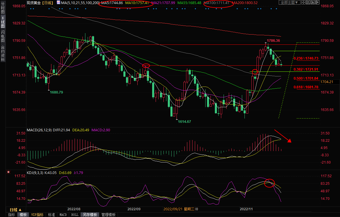 日线级别:震荡上涨后回调;KDJ死叉良好运行,MACD红色柱萎缩且有死叉趋势,K线形态有“倒V”反转的趋势,周二金价反弹受阻且录得上影线,5日均线下穿10日均线,相对高位的“阴三兵”看空信号仍在,短线金价的下行风险有所增加,关注周一低点1732.40附近支撑,若跌破该支撑,则增加短线看空信号,金价料将进一步试探1721.91附近支撑,该位置是1616-1786涨势的38.2%回撤位;进一步支撑参考100日均线1711.41附近,该位置的得失可以作为中线走势的参考,失守该位置前,中长线仍偏向多头。