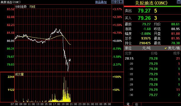 北京时间20:14,NYMEX原油期货下跌2.09%至79.25美元/桶;ICE布伦特原油期货下跌1.96%至85.98美元/桶。