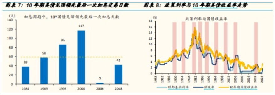 根据国金证券赵伟团队的统计,历史回溯来看,在1982年以后,美联储将中介目标由数量型目标M2增速转向价格型目标货币市场利率。此后的6轮加息周期里,10年期美债收益率多领先政策利率约1-2个季度见顶。相对特殊的2006年,在地产风险隐现时加息戛然而止,10年期美债利率与政策利率同步见顶。本轮美国宏观指标的“外强中干”,或指向美联储加息操作或止步于明年上半年。