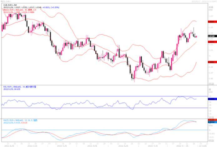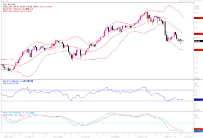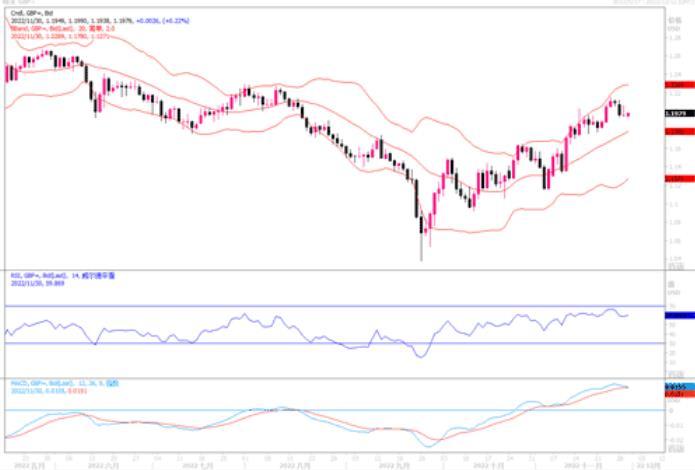 周二(11月29日),欧元兑美元走势平缓,波动幅度偏窄,全日微跌0.09%。当日欧洲时段,德国公布11月份CPI同比初值为11.3%,低于10月份的11.6%。西班牙通胀则连续第四个月减弱,并且降幅超过预期,与此同时,比利时11月整体CPI也放缓至10.6%。欧洲这些开始放缓的通胀数据,为那些希望欧洲央行放慢加息步伐的人提供了理由。只不过欧央行上至行长下至管委委员们,在近期的表态中尚未流露出这样的情绪,还是宣称压制通胀是其首要考虑的选项。这一切还是要等到12月份欧美各自在利率会议上的表现方可看清该货币对下一步的清晰走向。欧美周一下跌在1.0330之上受到支持,上涨在1.0500之下遇阻,当前陷入窄幅整理之中。MACD技术指标的信号线有形成死叉迹象,需谨慎防范冲高回落的风险。日内密切且留意1.0300的支撑,若跌破,进一步将考验1.02至1.0070的支撑。