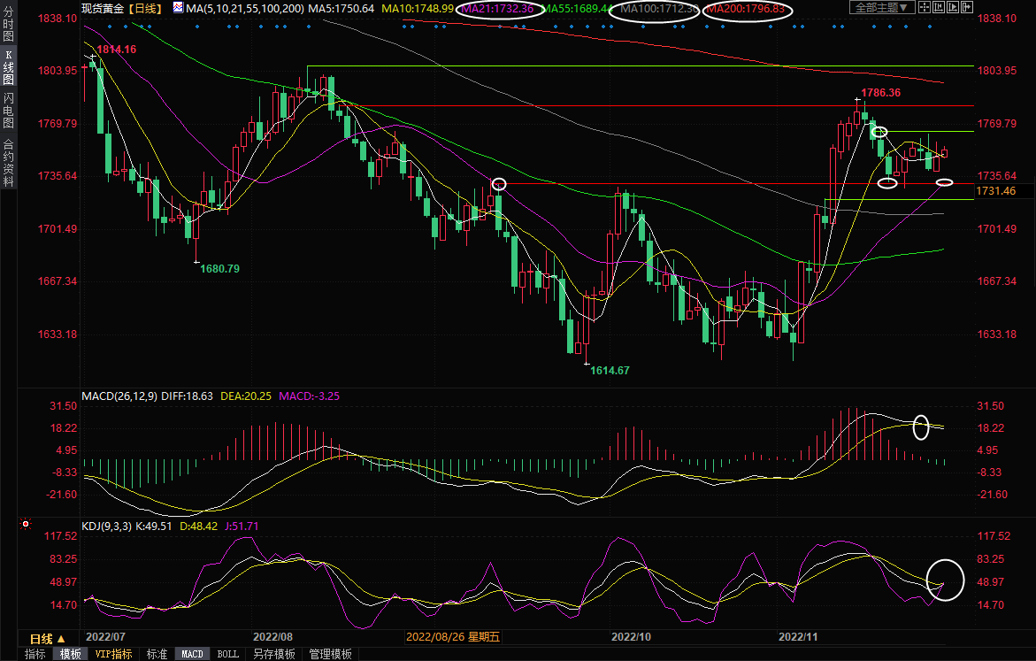日线级别:震荡;MACD初步死叉,KDJ有金叉迹象,短线走势变数较大,留意1732.36-1767.58区域突破情况,前者是21日均线附近支撑,后市是11月18日高点附近阻力,也分别接近近两周震荡区域的低点和高点。
