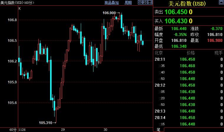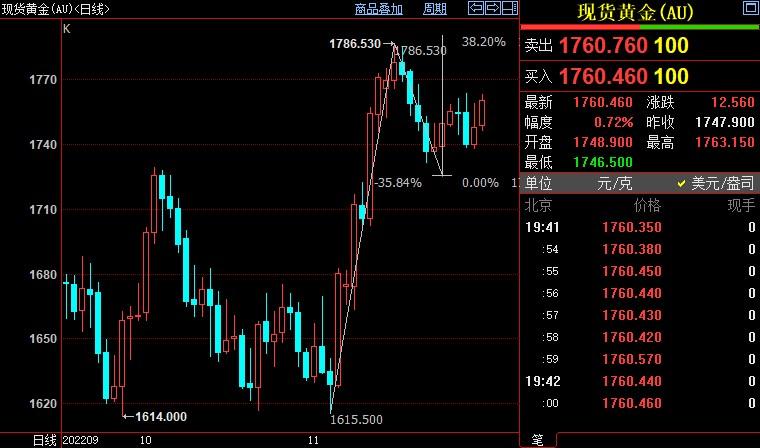 北京时间20:13,现货黄金上涨0.74%至1762.65美元/盎司;COMEX期金主力合约上涨0.75%至1776.9美元/盎司;美元指数下跌0.34%至106.45。