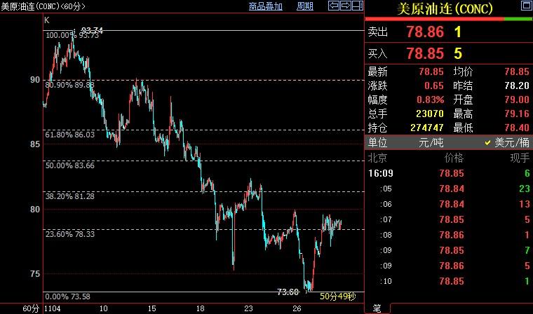 北京时间16:10,NYMEX原油期货上涨0.75%至78.79美元/桶;ICE布伦特原油期货上涨0.77%至84.90美元/桶。