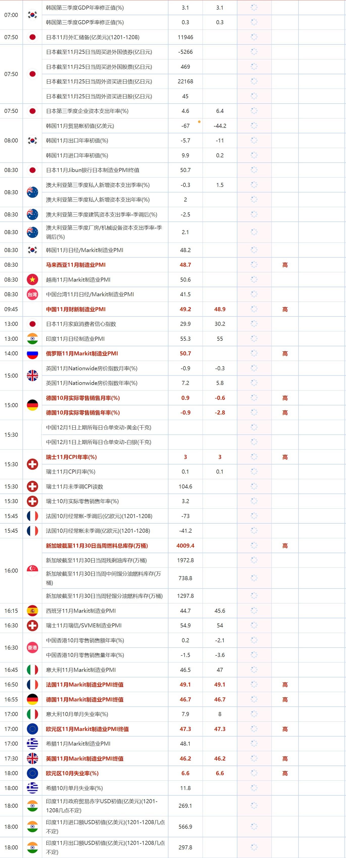 08:30 韩国11月日经/Markit制造业PMI , 前值 48.2 , 预期值 -- , 公布值:待发布
