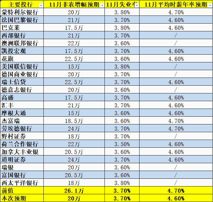 23家投行前瞻11月非农:增速料进一步放缓,黄金有望获得支撑 Dec 01,2022 汇通财经APP讯——北京时间周五(12月2日)20:30,美国将公布11月季调后非农就业人口变动和失业率。周四(12月1日),包括摩根士丹利在内的23家大型投行发表了对此次数据的前瞻,具体如下。23家大型投行预测显示,主要投行认为11月非农增速进一步下滑,但投行之间的增幅预期差距较大。具体而言,美国11月季调后非农就业人口增幅料介于15万-24万(前值26.1万),失业率料介于3.5%-3.8%(前值3.7%),平均时薪年率增幅料介于4.6%-4.7%(前值4.7%)。和前值相比,投行认为11月非农增速进一步放缓,相比之下失业率和平均时薪年率和前值相差不大。若数据显示11月非农增幅真如投行预测那样进一步下滑,黄金有望获得支撑。