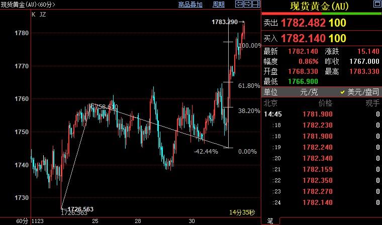 北京时间14:46,现货黄金上涨0.76%至1781.87美元/盎司;美元指数下跌0.48%至105.487。