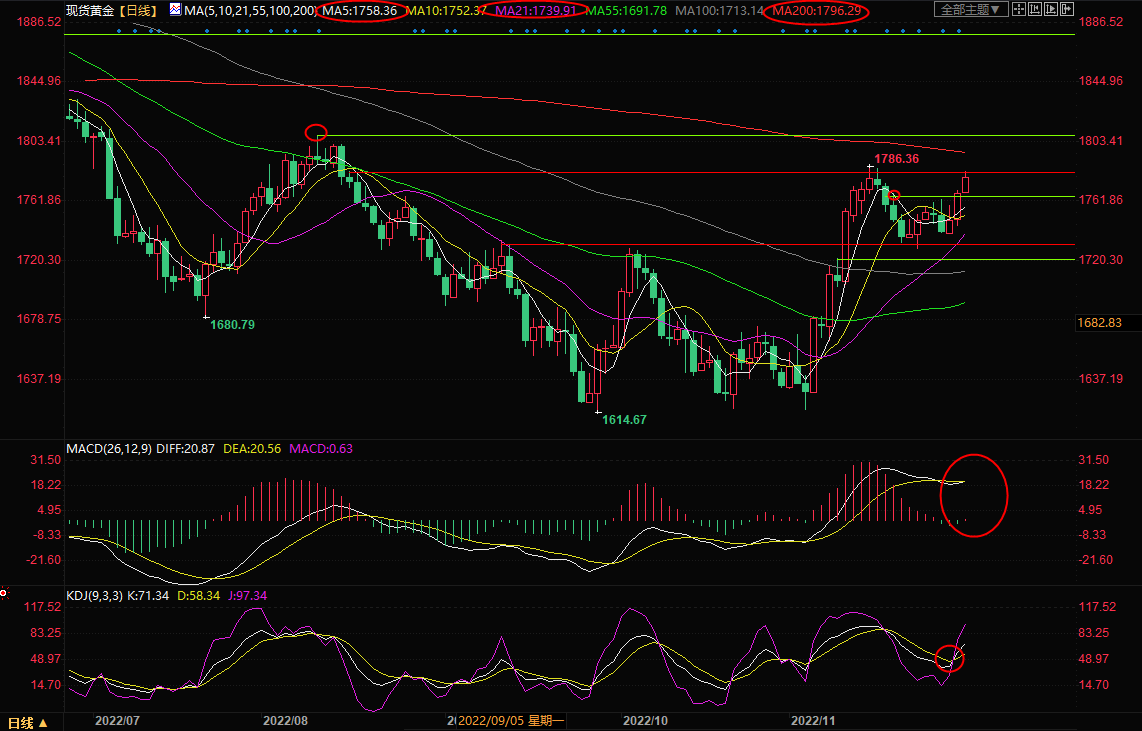 由于MACD红色柱较短,在顶破1786.36阻力前,仍需提防局部形成“M”顶的可能性。