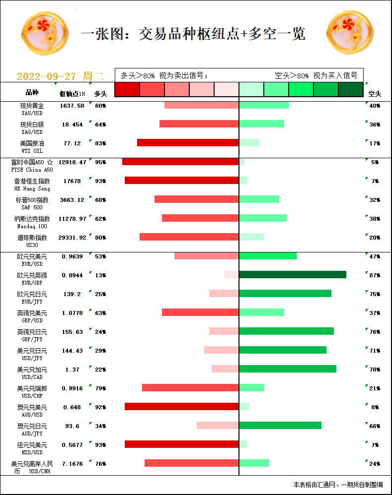 一张图:9月27日黄金白银、原油、股指、外汇“枢纽点+多空信号” Sep 27,2022 一张图:9月27日黄金白银、原油、股指、外汇“枢纽点+多空信号”;周二(9月27日)一张图看“枢纽点+多空信号”,品种包括:黄金、白银、原油、股指、欧元、英镑、日元、澳元、纽元、加元、富时中国A50、恒生指数、道指、标普500等。美联储官员“鹰”气逼人,金价退守1620,多头还有机会吗?
