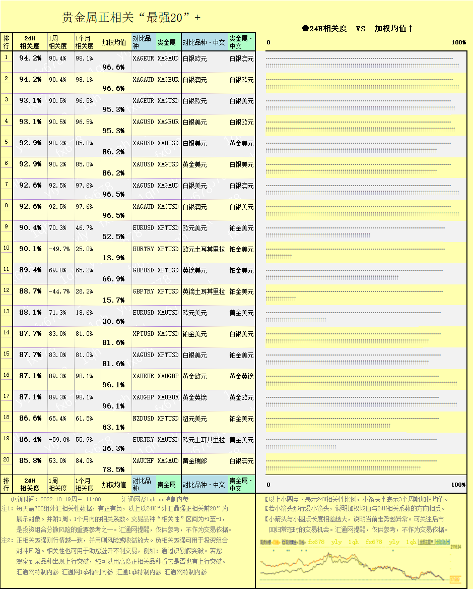 ★贵金属VS外汇的正相关最强前三个分别是:白银欧元(XAGEUR) VS 白银澳元(XAGAUD)的“正相关”强度高达94.20%。白银澳元(XAGAUD) VS 白银欧元(XAGEUR)的“正相关”强度高达94.20%。白银欧元(XAGEUR) VS 白银美元(XAGUSD)的“正相关”强度高达93.10%。汇通网提醒,更多参考本文如下表格。