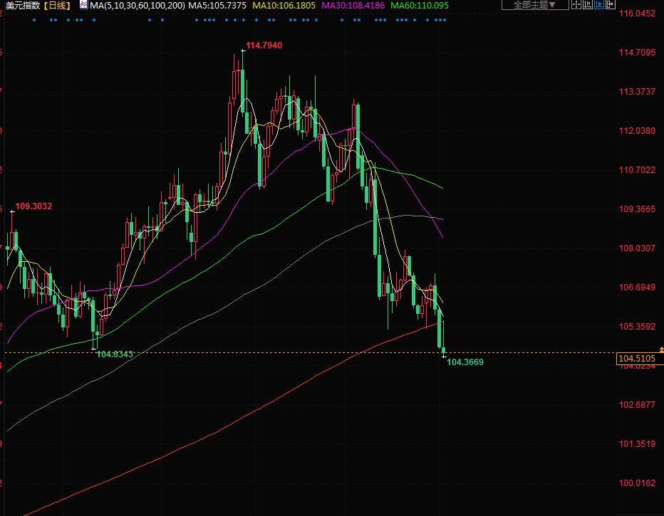 美元指数尾盘下跌0.13%,报104.50;欧元上涨0.10%,至1.0537美元,为6月28日以来最高。