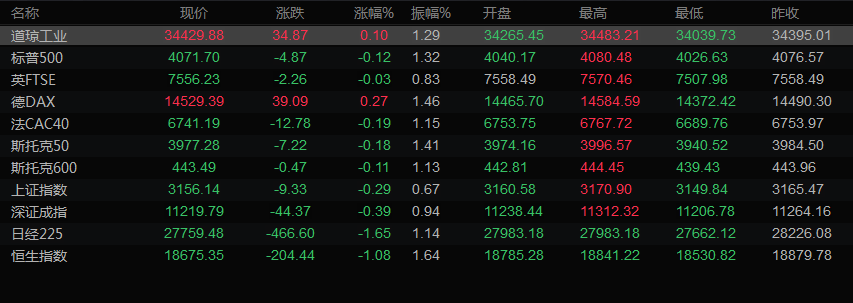 美股收盘情况:道琼斯工业指数上涨0.1%,至34429.88点;标普500指数下跌0.12%,至4071.7点;纳斯达克指数下跌0.18%,至11461.50点。