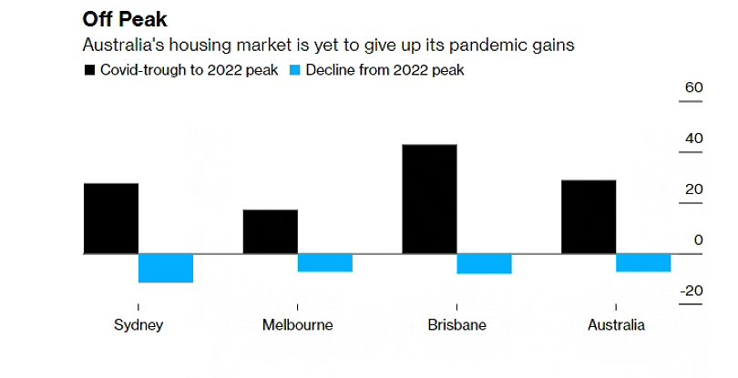 图5:离开峰值(澳大利亚房地产市场还未回吐其在疫情期间的涨幅,黑色表示从疫情谷底迈向2022年峰值,蓝色表示从2022年峰值下跌)