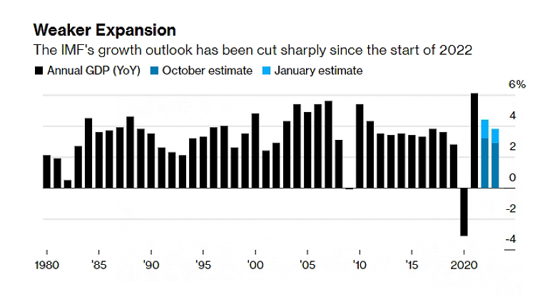 图6:较弱的扩张(IMF大幅消减2022年初以来的经济增长前景,黑色:年度GDP同比,深蓝:10月估计,浅蓝:1月估计)