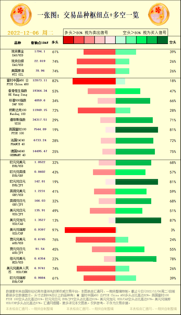 汇通财经APP讯——一张图:交易品种枢纽点+多空占比一览。截止今日(2022/12/06周二)目前最新多空数据显示,头寸达到80%及以上的品种有:★ 富时中国A50 ☆FTSE China A50多头占比高达82%。