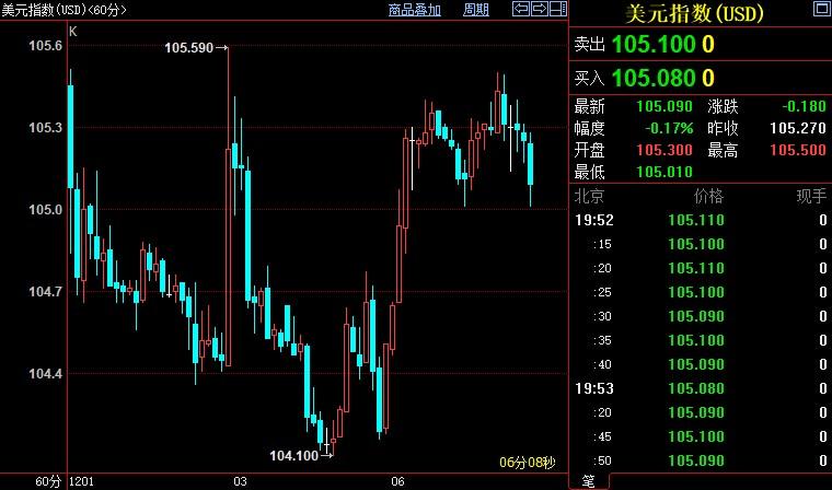 北京时间19:53,现货黄金上涨0.49%至1777.32美元/盎司;COMEX期金主力合约上涨0.48%至1789.7美元/盎司;美元指数下跌0.18%至105.096。