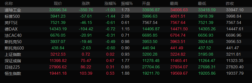 美股收盘情况:道琼斯指数收盘下跌1.03%,报33596.08点;标普500指数收盘下跌1.44%,报3941.26点;纳斯达克综合指数收盘下跌2.00%,报11014.89点。