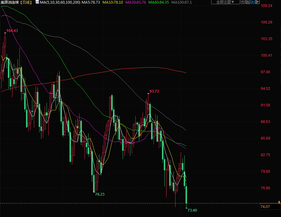 商品收盘情况:布伦特原油期货下跌4%,结算价报每桶79.35美元。美国原油期货下跌3.5%,结算价报每桶74.25美元,为今年迄今最低;美国期金收涨0.1%,结算价报1782.4美元。