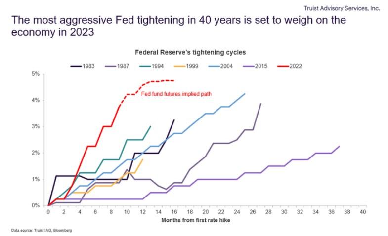 美国股市从本周开始就受到重创,而此前寄希望通胀可能正在回落,可能会让美联储通过较小的增量加息来略微“转向”,股市从2022年的低点反弹。但今年的快速加息已经让美联储走上了自20世纪80年代以来最激进的紧缩道路(见以下图表),这最终应该会给美国的经济增长和通胀降温。