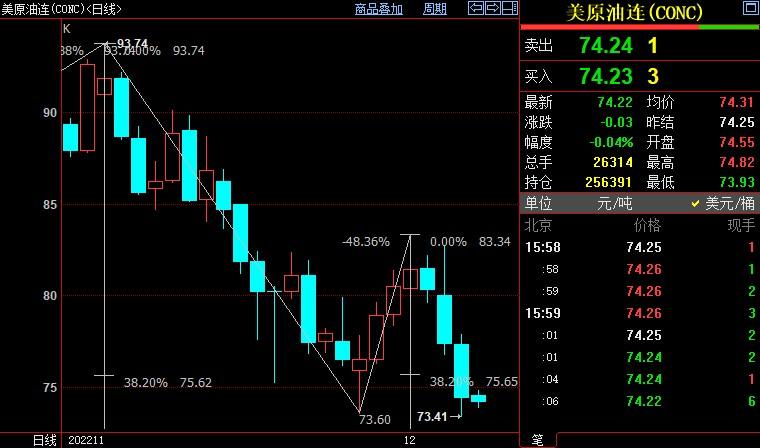 北京时间16:00,NYMEX原油期货下跌0.18%至74.13美元/桶;ICE布伦特原油期货上浮0.04%至79.37美元/桶。两市隔夜分别创2021年12月27日以来新低73.41美元/桶和今年1月4日以来新低78.70美元/桶。