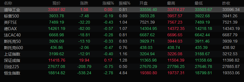 美股收盘情况:道琼斯指数收盘上涨0.53点,报33596.87点;标普500指数收盘下跌0.18%,报3933.99点;纳斯达克综合指数收盘下跌0.51%,报10958.55点。