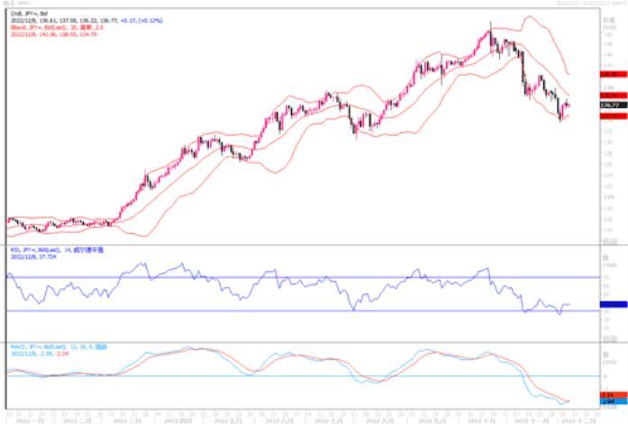 在周三的外汇市场上,美元兑日元日内下跌了0.5%,收盘于136.62。日本最新公布的贸易逆差超过预期达到150亿美元,出口同比增长25.3%低于9月份28.9%的同比增长。且日本第三季度实际GDP年化季环比终值降0.8%,但还是高出预期的-1.1%数值。而且日本央行审议委员中村富明还宣称,宽松货币政策的利大于弊。可见,日本央行尚无意于改变当前的宽松货币政策。但是,由于近阶段市场对于美元利率峰值即将来临的预期浓烈,因此推动了日元兑美元价值回归交易的产生。日线图上报收上影线小阴线,波动幅度陷入窄幅之中。从4小时图来看,,MACD零轴附近运行,红色动能柱开始收敛,随机指标KDJ开始下行,冲击138不过,美日有重新下行趋向。下方首要支撑136.50-60,第二支撑136.00,若跌穿136.00,下方将会再度往一周前的低点133.63测试。