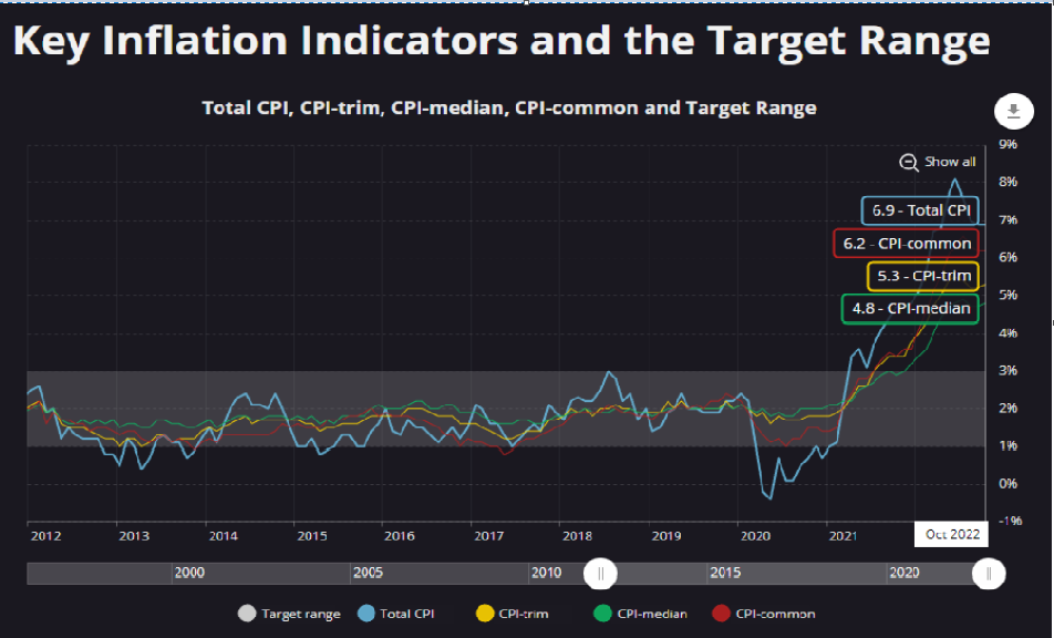 最新公布的数据显示,加拿大10月消费者物价指数(CPI)同比增速保持在6.9%,核心CPI保持在5%左右,均超出央行目标的2至3倍。许多加拿大人经常购买的商品和服务价格大幅上涨,短期通胀预期仍在上升。